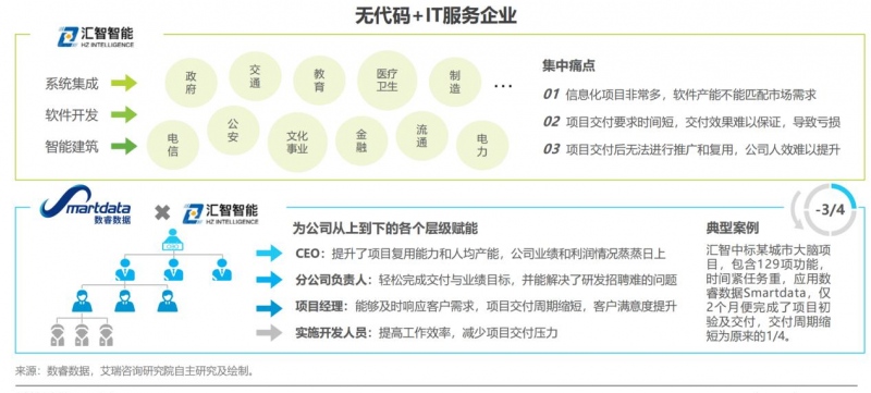 汇智智能科技有限公司是一家专业从事系统集成、软件开发、智能建筑的高新技术企业。公司服务范围广泛,客户覆盖政府、电力、交通、金融、电信、公安、教育、医疗卫生、文化事业、制造企业、流通企业等多个行业。汇智成立以来,业务保持持续高速增长,项目服务分布于全国,公司总人数达上千人。在高业务增长的同时,汇智遇到了“项目多,人不够 用”“为追求快速交付质量难以控制““项目间复用程度低,公司人效难以提升”的难题。运用数睿数据企业级无代码开发工具后,汇智的交付效率得以大大提升,项目周期缩短为原来的1/4。汇智内部人手得到了释放,使得研发部门可以投入于新技术研究,业务部门也进一步加大行业解决方案的沉淀和集成,公司发展走向良性循环。