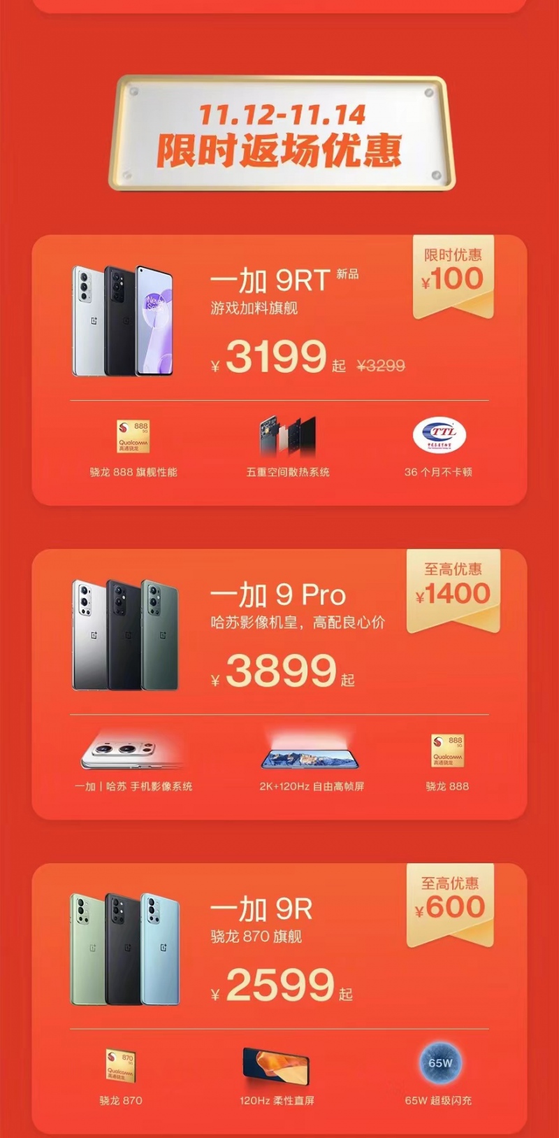 目前,一加双十一返场优惠活动仍在进行中,至高优惠 1400 元,并支持多期免息。用户可前往 OPPO 商城、京东、天猫、苏宁易购、一加授权零售店进行购买,更多优惠资讯可关注一加官网和一加官方微博等渠道。