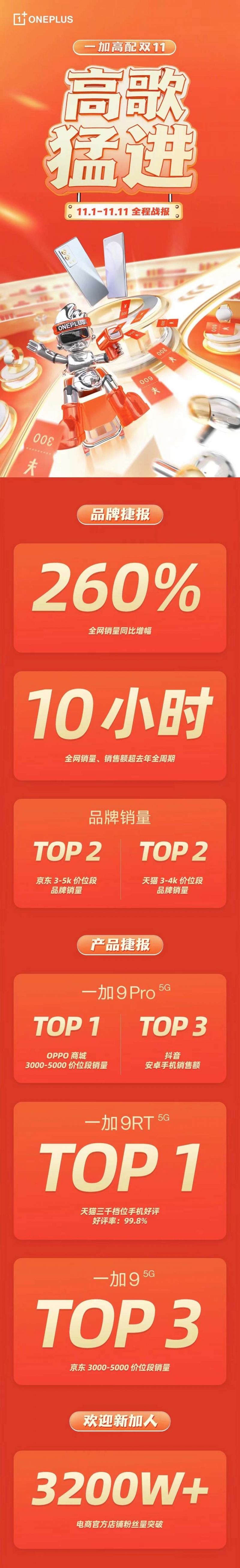 11 月 12 日,一加手机公布双十一购物节战绩,全网销量同比增幅 260%,10 小时全网销量、销售额超去年全周期,京东天猫价位段品牌销量稳居 TOP 2,其中一加 9 Pro 拿下 OPPO 商城 3000-5000 价位段销量 TOP 1,抖音安卓手机销售额 TOP 3;一加 9RT 荣获天猫三千档位手机好评 TOP 1,好评率高达 99.8%;一加 9 则拿下京东 3000-5000 价位段销量 TOP 3;电商官方店铺粉丝量突破 3200W+。