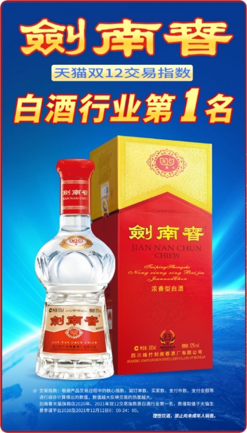 2021年“双12”天猫年终购物节战报出炉,剑南春天猫平台官方旗舰店以超高人气和火爆的销量,勇夺天猫“双12”白酒品牌旗舰店交易指数第一名。
