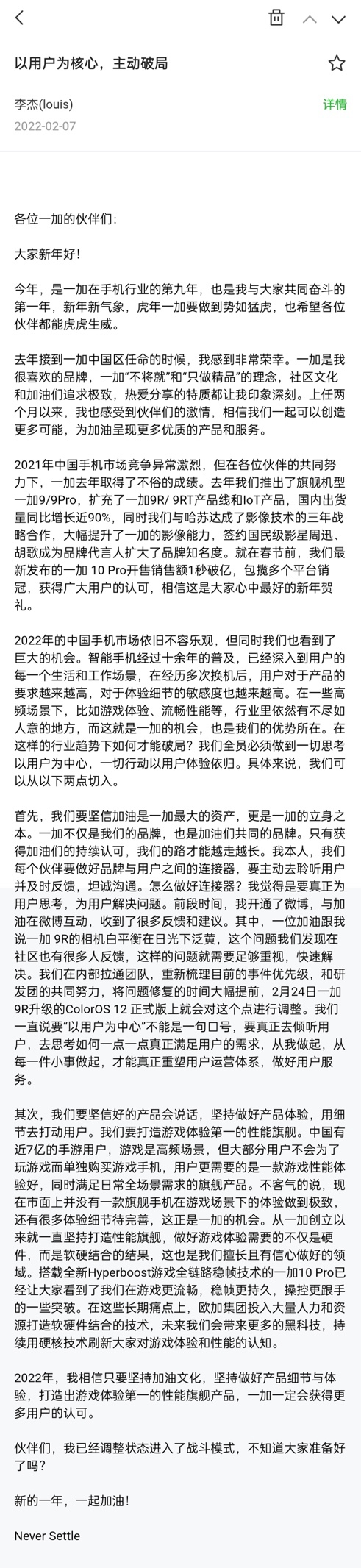 2月7日,一加中国区总裁李杰的内部信曝光,李杰在信中总结了一加在过去的2021年取得的成绩,认为2022年中国手机市场依旧不容乐观,但仍存在巨大机会。一加未来要坚持加油文化,以用户为中心,做真正满足用户需求的产品,打造出游戏体验第一的性能旗舰。