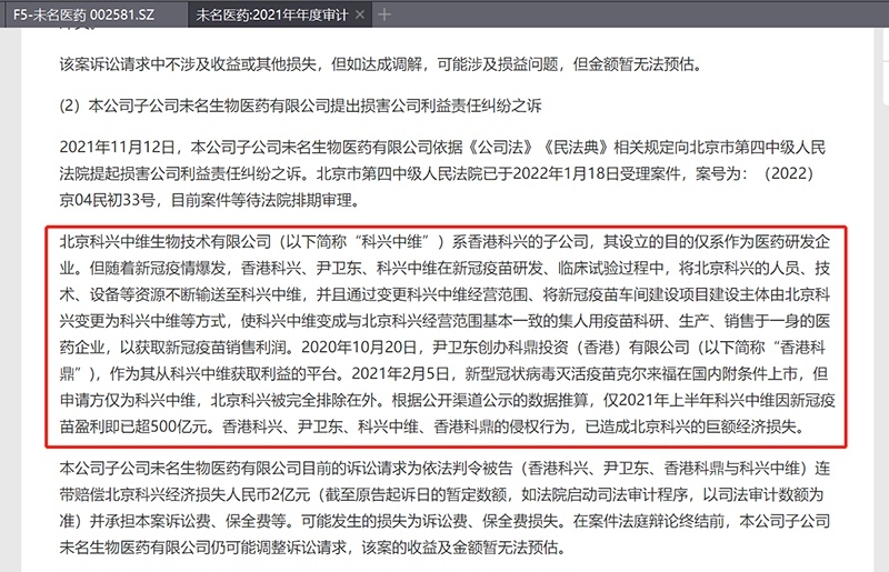 在关于未名医药子公司未名生物与尹卫东及科兴中维的诉讼中,提及了科兴中维涉嫌侵占北京科兴资源的一些运作手法。