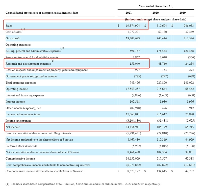 4月29日,科兴控股向美国证券交易委员会提交了2021年年报,数据显示,科兴2021年实现总营收193.75亿美元(约合人民币1250亿元),净利润144.6亿美元(约合人民币933亿元),研发支出1.55亿美元(约合人民币10亿元)。(2021年平均汇率:1美元=6.4512元人民币)。销售额增长主要来自新冠疫苗。