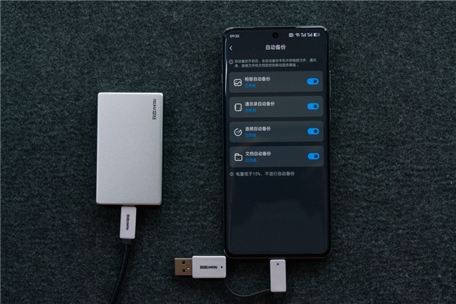 进入自动备份功能后,可以按需勾选相册、通讯录、音频和文档的自动备份。值得一提的是,App内也做了提示:电量低于15%时,不进行自动备份。这样可以防止手机电量过低自动关机而导致的备份失败,非常贴心。
