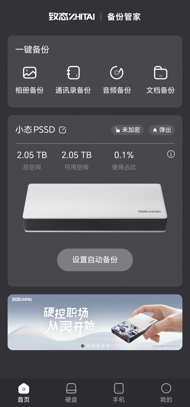 将致态灵·先锋版移动固态硬盘通过Type-C数据线连接到手机上后,致态备份管家App的初始页面如上图,接着点击“设置自动备份”。