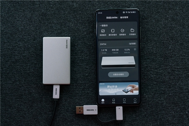 设置完成后,回到主页面,可以看到数据“自动备份中”。首次完成自动备份设置后,后续新增的数据进行自动备份的操作就更为简化了,即仅需将PSSD连接至设备,并开启致态备份管家App,自动备份便开始了。日后,即使手机不慎丢失,美好回忆也能够通过致态灵·先锋版移动固态硬盘完整保存下来。